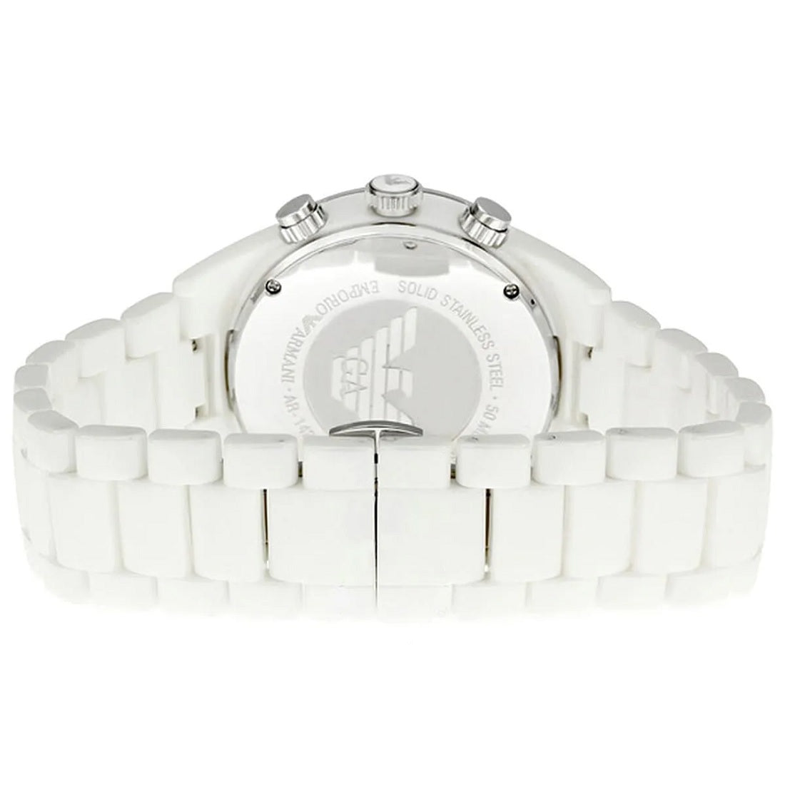 Emporio Armani AR1424 men’s watch with white ceramic case and strap, sleek chronograph dial, and modern luxury style—perfect for everyday elegance.